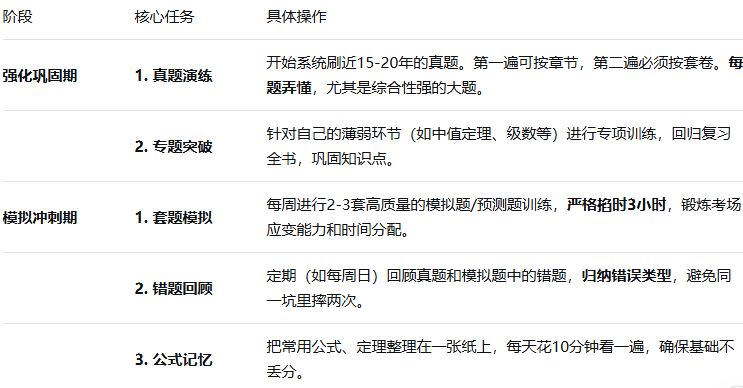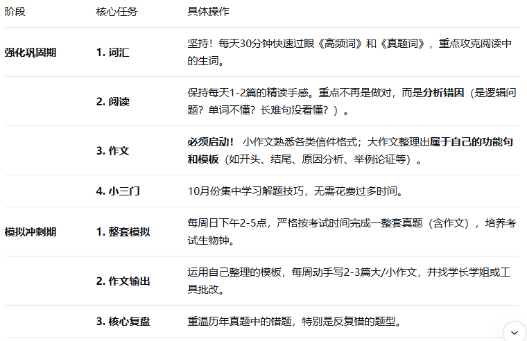 - 模拟为王,复盘是魂:冲刺期的核心就是从“输入”转向“输出”,通过反复模拟和复盘,将知识转化为分数。