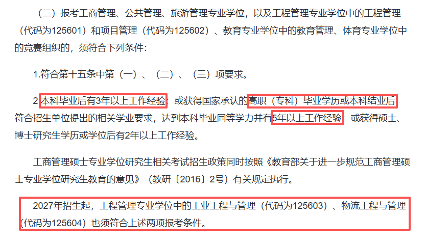 “2027年招生起,工程管理专业学位中的工业工程与管理(代码为125603)、物流工程与管理(代码为125604)也须符合上述两项报考条件。”
