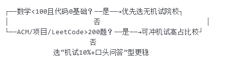 - 数学强+代码强→可冲机试高占比名校,用机考拉分逆袭;但务必提前3个月每日3题保持手感。