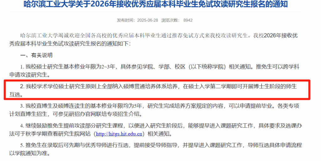 哈尔滨工业大学发布《关于2026年接收优秀应届本科毕业生免试攻读研究生报名的通知》,明确提到:“全校学术学位硕士研究生原则上全部纳入硕博贯通培养体系培养,在硕士入学第二学期即可开展博士生阶段的师生互选;全校直博生及硕博连读生的基本修业年限均为5年。”