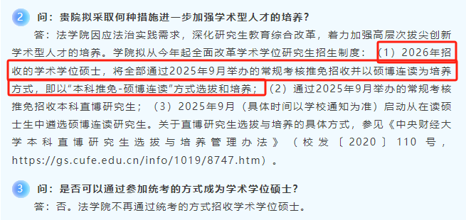 中央财经大学法学院发布一则26年硕士招生问答,其中明确表明,“26年招收的学术学位硕士,将全部通过25年9月举办的常规考核推免招收并以硕博连读为培养方式。”