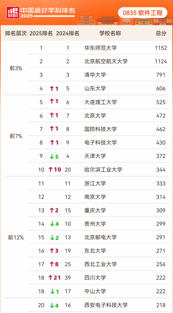 💻软件工程专业排名TOP5分别为: 🥇华东师范大学、🥈北京航空航天大学、🥉清华大学、山东大学和大连理工大学。