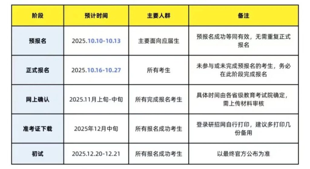 明天开始正式报名,26考研正式报名时间10月16日至27日,每天9点到22点。正式报名面向所有符合报考条件的考生,包括应届毕业生和往届毕业生。