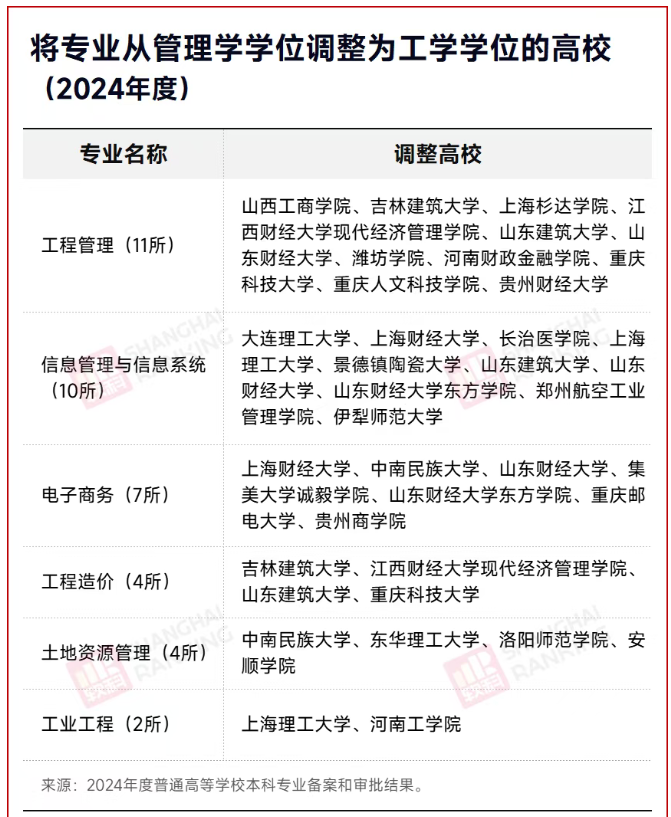 同一专业,不同学校授予学位可能不同。在教育部发布的24年度本科专业备案和审批表中,有27所高校、38个专业点将专业授予学位从管理学调成了工学。详情如下: