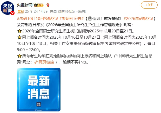 刚刚教育部研招网正式发布《2026 年全国硕士研究生招生工作管理规定》,明确预报名推迟至 10 月 10 日 - 13 日(每日 9:00-22:00),正式报名为 10 月 16 日 - 27 日,比往年整整延后半个月!初试时间仍为 12 月 20 日 - 21 日,并未随报名推迟变动。